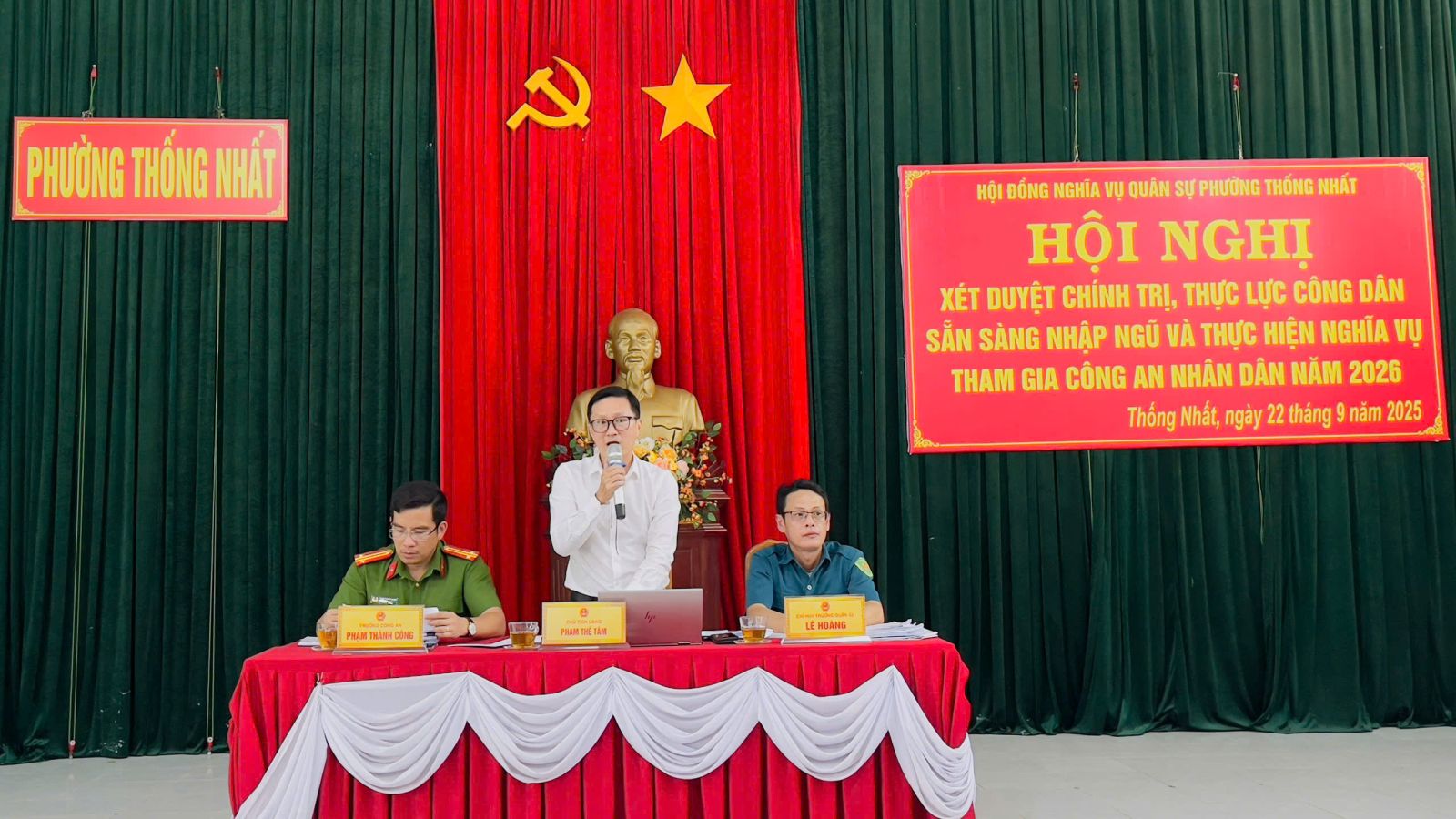 Chiều 22-9, Hội đồng nghĩa vụ quân sự (NVQS) phường Thống Nhất (tỉnh Gia Lai) tổ chức cuộc họp xét duyệt thực lực, chính trị đối với 2.250 công dân trong độ tuổi sẵn sàng nhập ngũ năm 2026. Ông Phạm Thế Tâm-Phó Bí thư Đảng ủy, Chủ tịch UBND phường, Chủ tịch Hội đồng NVQS phường Thống Nhất chủ trì cuộc họp. Tại cuộc họp, các đại biểu đã nghe báo cáo xét duyệt chính trị, báo cáo xét duyệt thực lực; đối chiếu hồ sơ công dân trong diện gọi nhập ngũ. Đồng thời, tập trung thảo luận, biểu quyết về các trường hợp thuộc diện tạm hoãn, miễn gọi nhập ngũ trong thời bình; công dân đang theo học tại các trường THPT, cao đẳng, đại học hệ chính quy; trường hợp tạm hoãn do học vấn dưới lớp 8, chưa cư trú thực tế tại địa phương hoặc có vướng mắc về chính trị, vi phạm pháp luật, đang trong quá trình bị cơ quan chức năng xem xét xử lý.