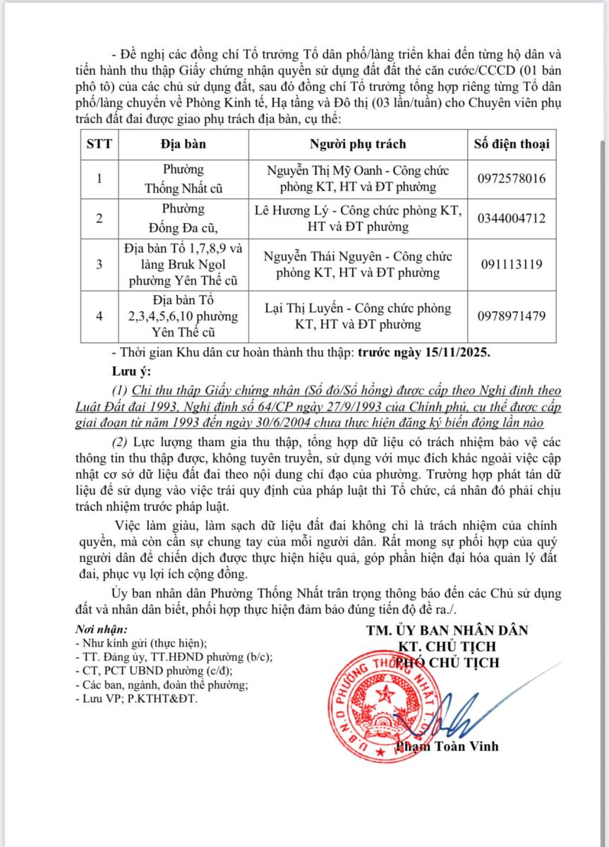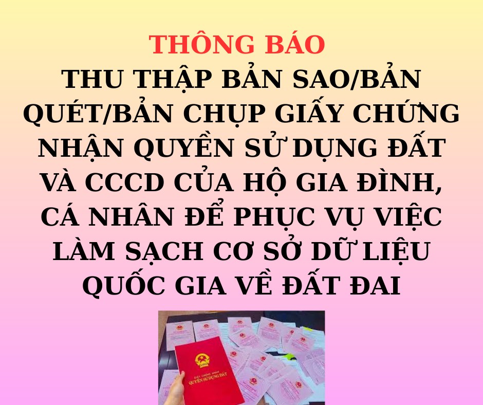 UBND phường Thống Nhất thông báo về việc thu thập thông tin Giấy chứng nhận quyền sử dụng đất và thẻ căn cước công dân của chủ sử dụng đất ( phục vụ chiến dịch làm giàu, làm sạch cơ sở dữ liệu quốc gia về đất đai)