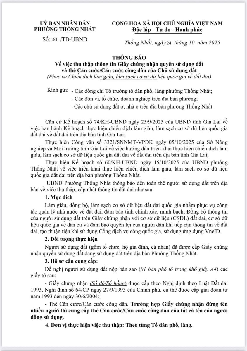 Thứ tư, 29/10/2025 | 07:51 A- A A+ | UBND phường Thống Nhất thông báo về việc thu thập thông tin Giấy chứng nhận quyền sử dụng đất và thẻ căn cước công dân của chủ sử dụng đất ( phục vụ chiến dịch làm giàu, làm sạch cơ sở dữ liệu quốc gia về đất đai) Chia sẻ Đọc bài Lưu
