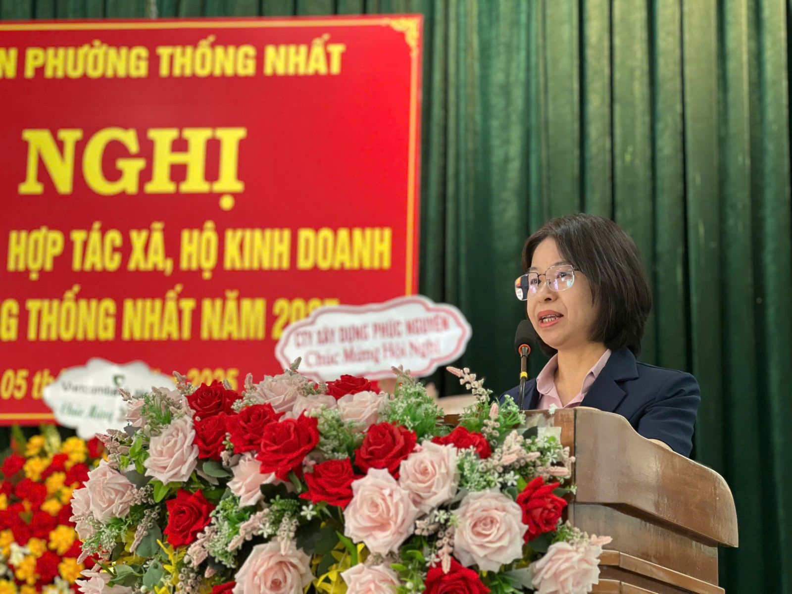 Phát biểu tại Hội nghị, đồng chí Trần Thị Hồng Nguyệt - Bí thư Đảng ủy, Chủ tịch Hội đồng nhân dân phường biểu dương những kết quả, đóng góp của các doanh nghiệp, hợp tác xã và hộ kinh doanh trên địa bàn trong thời gian qua. Dù đối mặt với nhiều khó khăn chung của thị trường, các đơn vị vẫn nỗ lực duy trì tăng trưởng, tạo việc làm cho người lao động, đóng góp tích cực cho thu ngân sách, cho phong trào xây dựng đô thị văn minh và các hoạt động an sinh xã hội của địa phương.