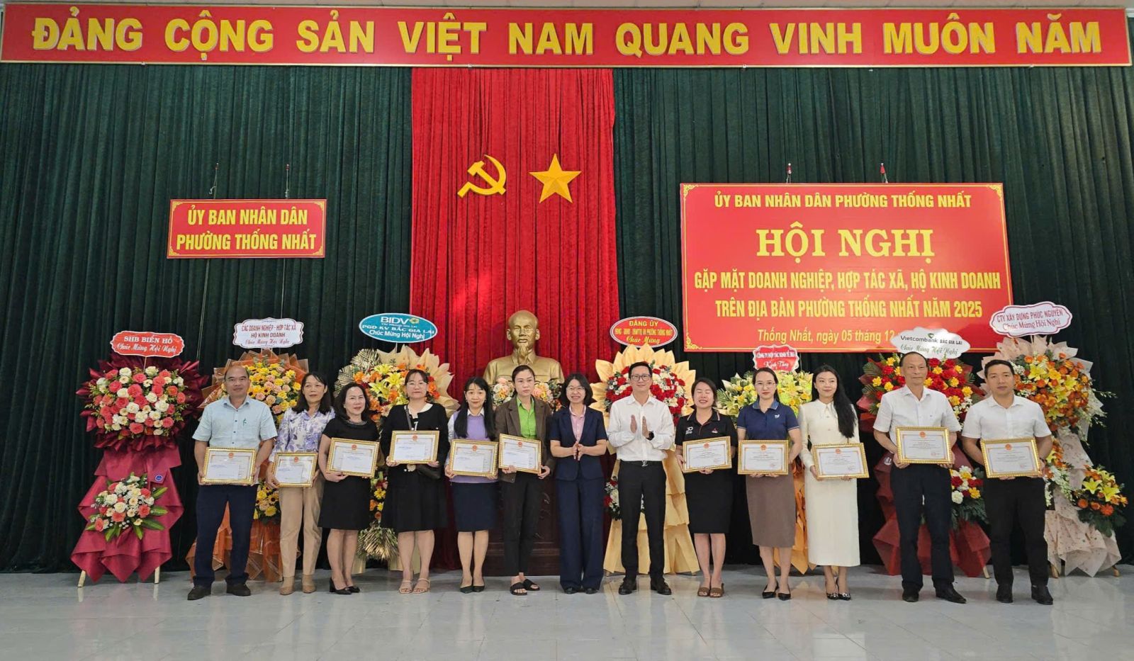 Dịp này, Chủ tịch UBND phường Thống Nhất quyết định tặng Giấy khen khen thưởng đối với 12 doanh nghiệp, hộ kinh doanh và hợp tác xã tiêu biểu, có nhiều đóng góp cho sự phát triển kinh tế - xã hội của địa phương.