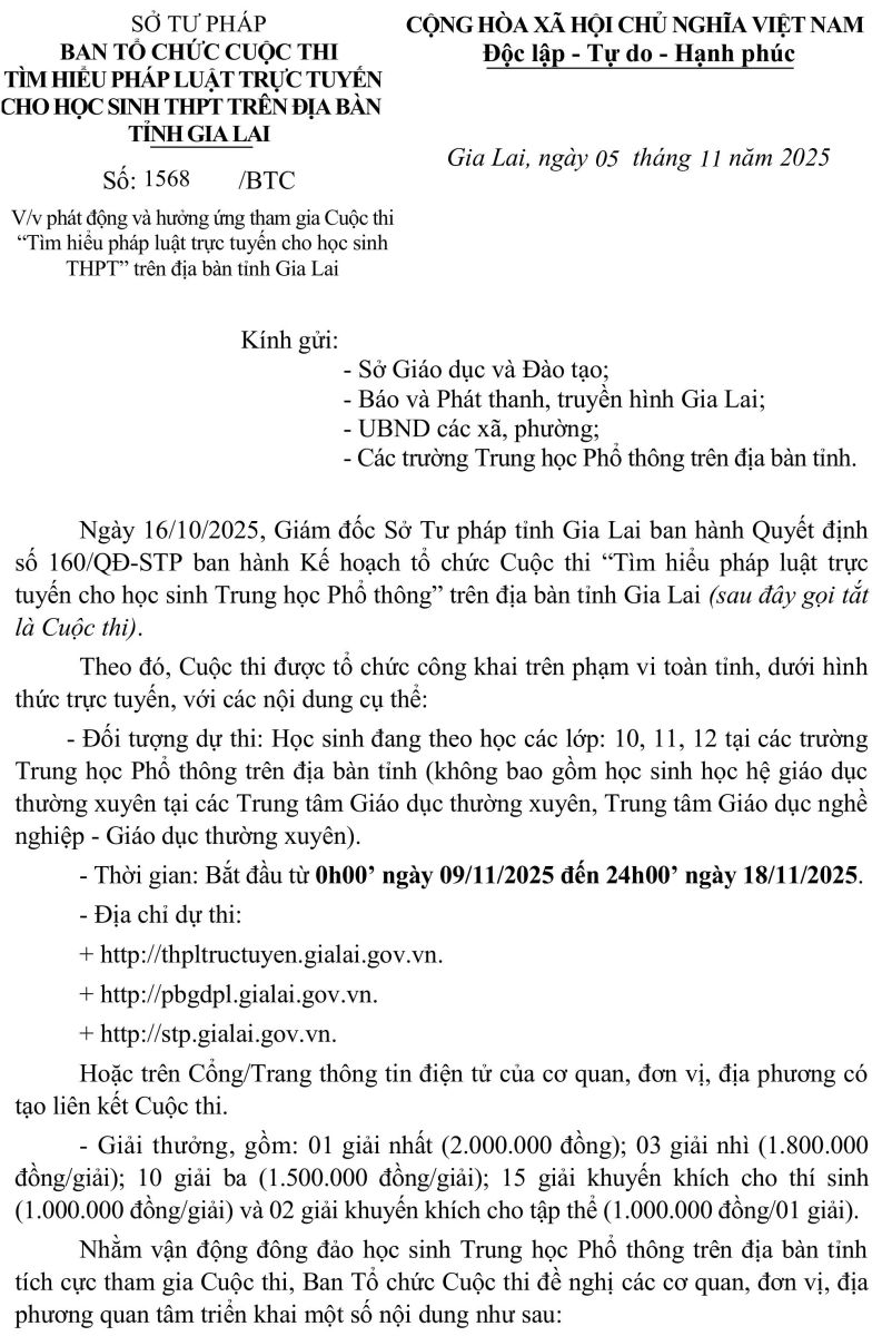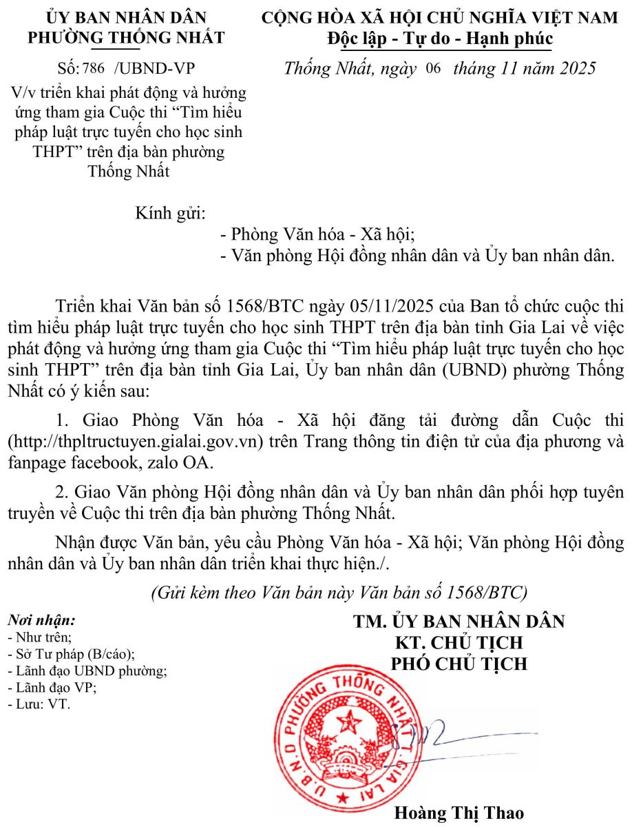 Thứ sáu, 07/11/2025 | 07:50 A- A A+ | Triển khai phát động và hưởng ứng tham gia Cuộc thi “Tìm hiểu pháp luật trực tuyến cho học sinh THPT” trên địa bàn phường Thống Nhất Chia sẻ Đọc bài Lưu Đường dẫn Cuộc thi (http://thpltructuyen.gialai.gov.vn)