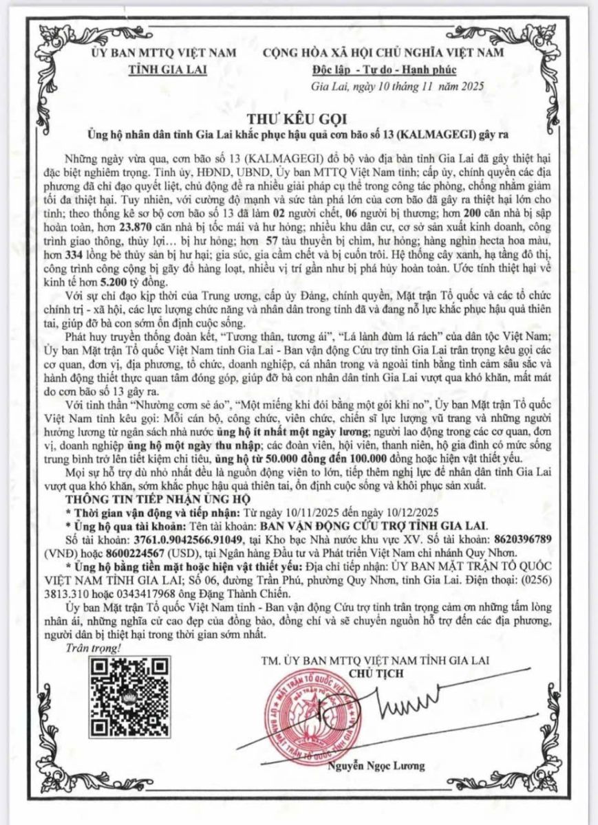 Mọi sự ủng hộ xin gửi về tài khoản: Ban vận động Cứu trợ tỉnh Gia Lai; số tài khoản: 3761.0.9042566.91049, tại Kho bạc Nhà nước khu vực XV; số tài khoản: 8620396789 (VND) hoặc 8600224567 (USD) tại Ngân hàng Đầu tư và phát triển Việt Nam chi nhánh Quy Nhơn.